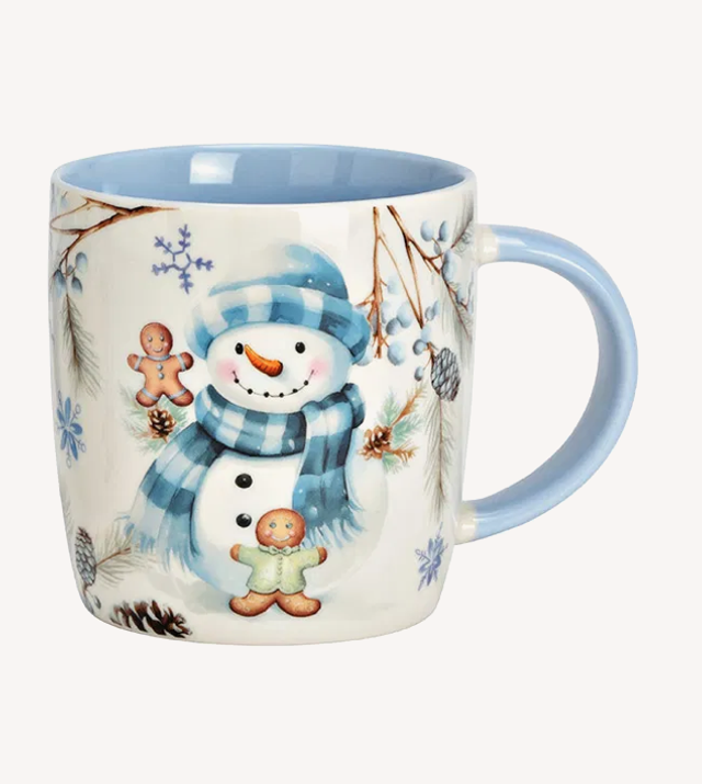Een paar feestelijke keramische mok met een schattige sneeuwpop, versierd met peperkoekkoekjes en winterthema-decoraties in zachte blauwe en witte kleuren.