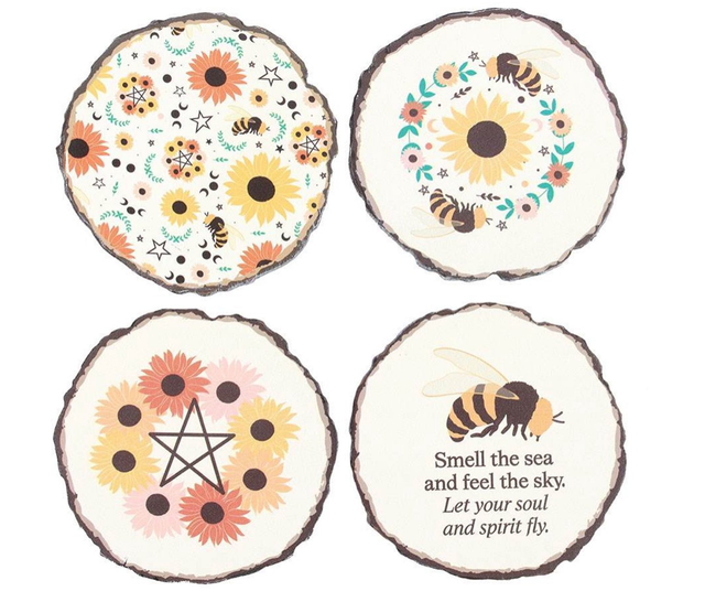 Breng een vleugje zomermagie op tafel met deze set van 4 houten onderzetters. Elke onderzetter heeft een uniek ontwerp geïnspireerd op de zomerzonnewende, inclusief zonnebloemen, pentagrammen, maanstanden en bijen. Perfect om het huis te versieren met de levendige energie van het seizoen.