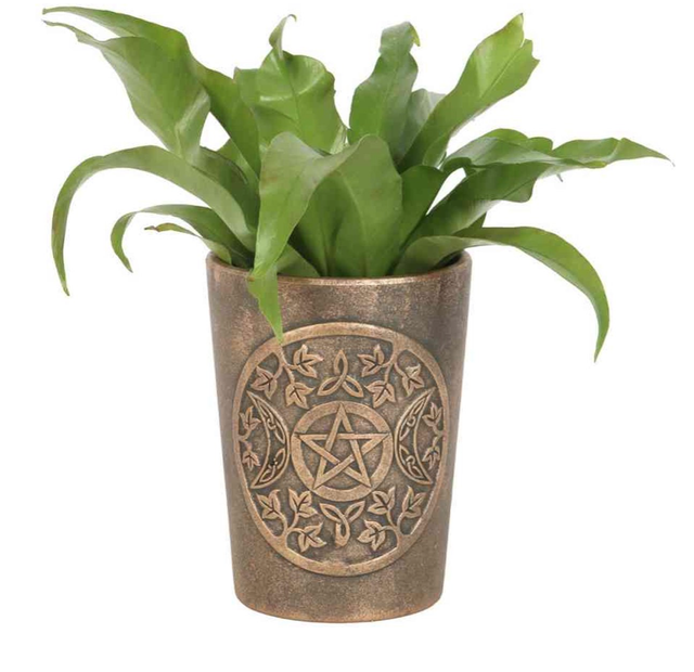 Deze betoverende Triple Moon Terracotta Bronzen Plantpot is voorzien van Triple Moon-kunstwerken. De Drievoudige Maan vertegenwoordigt de wassende, volle en afnemende manen die betrekking hebben op de drie levensfasen. De plantenpot is prachtig gedetailleerd en voegt een vleugje mystieke charme toe aan elke ruimte. Deze terracotta plantenpot is afgewerkt met een verouderd bronseffect. Een perfect cadeau voor natuurliefhebbers.