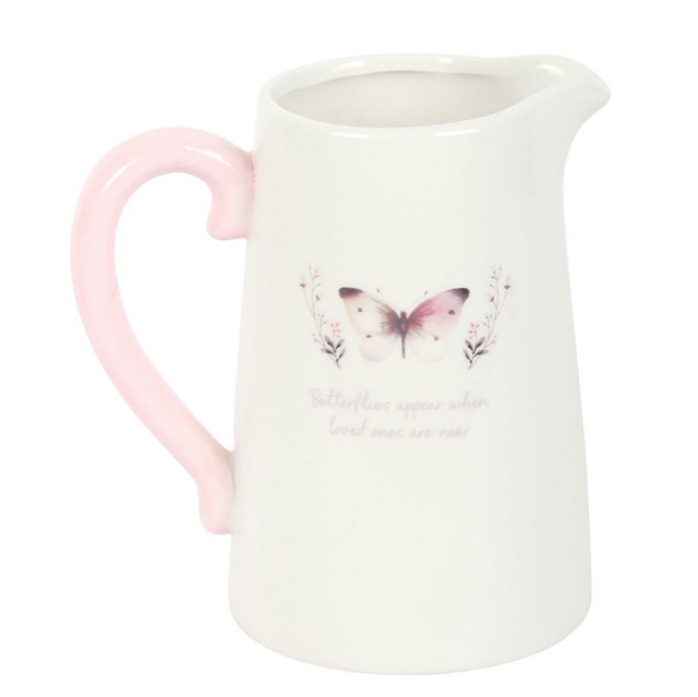 Geef je huis een persoonlijk tintje met deze decoratieve keramische kan, perfect voor het presenteren van verse of gedroogde bloemen. Met een subtiel grijs vlindermotief en de ontroerende tekst 'Vlinders verschijnen wanneer geliefden in de buurt zijn', is dit een betekenisvol cadeau voor iedereen die de herinnering aan een speciaal iemand koestert.